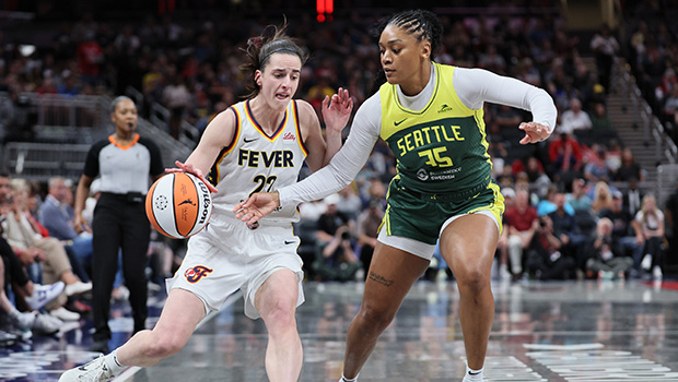 Caitlin Clark and Victoria Vivians share a heated moment on the court after a three-point shot.